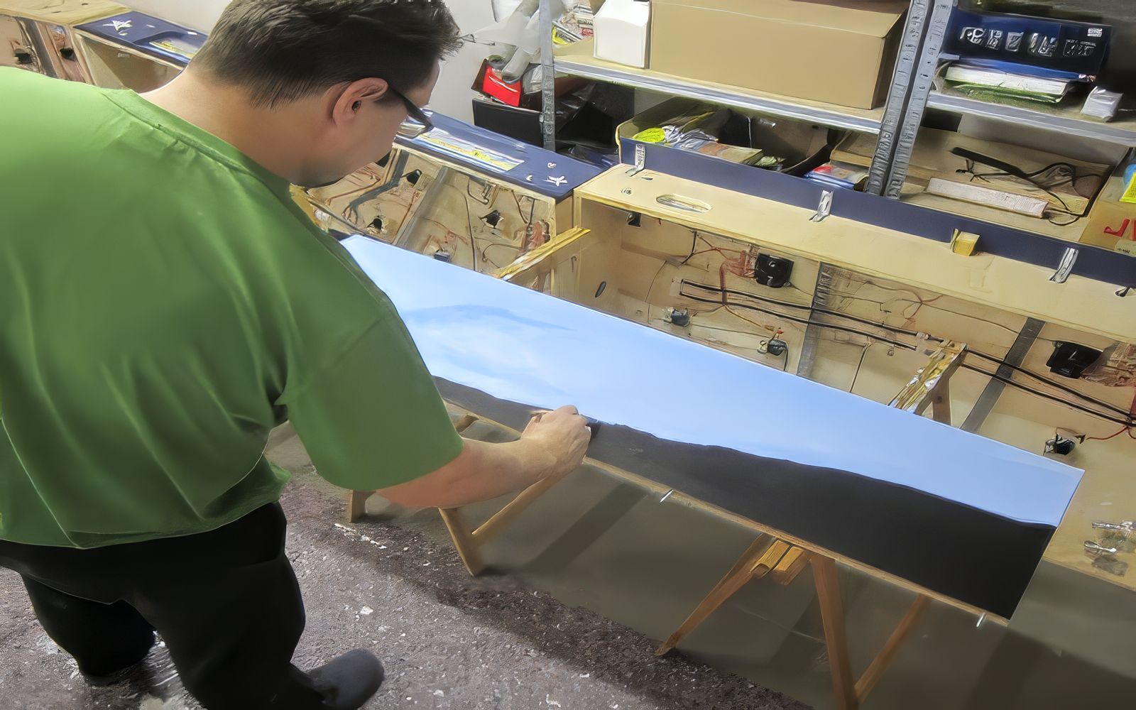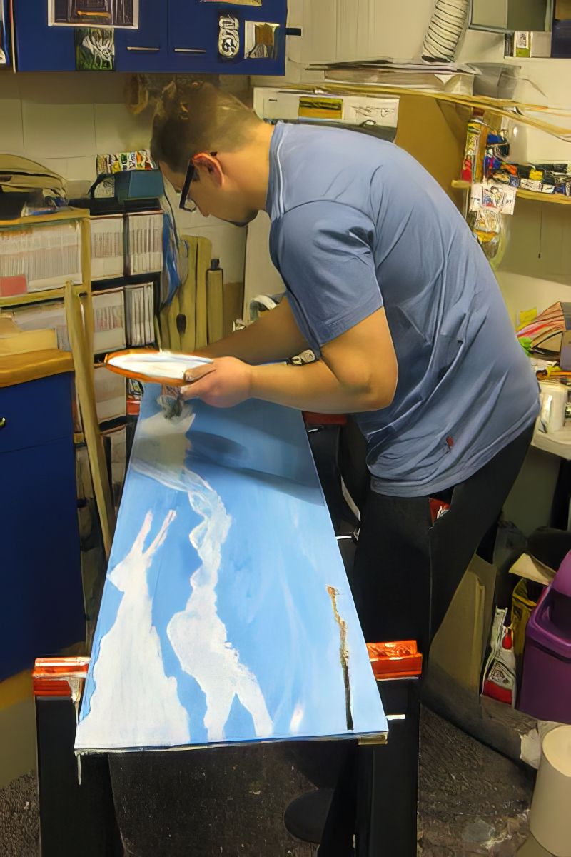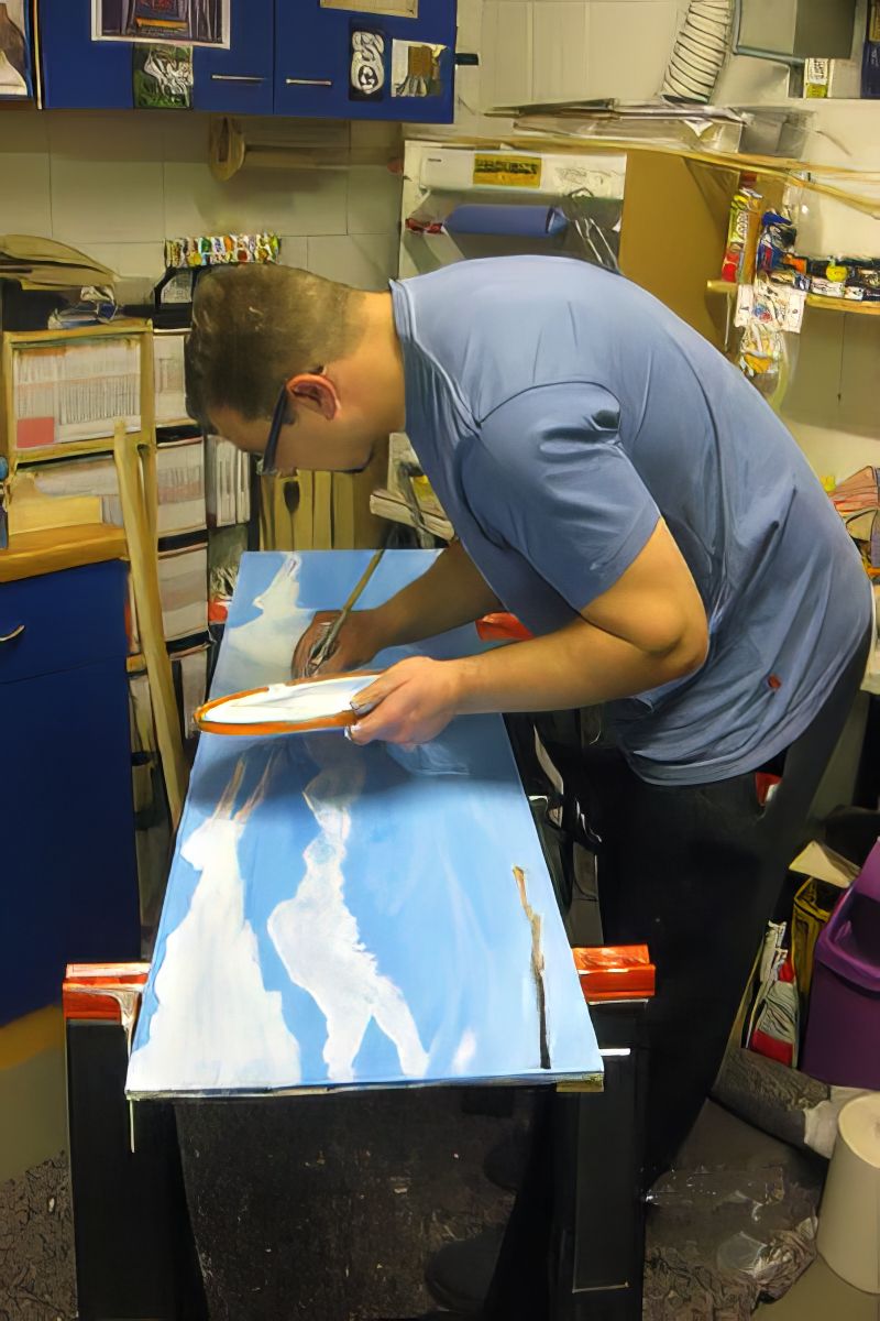 Bild 1 - wir konnten unseren Freund Martin gewinnen, unsere Hintergründe zu malen. Martin malt, neben seinem normalen Job, Landschaftsbilder mit Ölfarben. Er hat bereits den Eisenbahnkeller unseres Vereins ausgemalt. Auf unseren Holzplatten verwendet er normale Acrylfarben. Auf diesem Bild sind (nach kompletter Einfärbung des Brettes mit Blau) die Wolkenformationen in mehreren Schichten an der Reihe. Die Wirkung ist schon jetzt toll. Allerdings ist es auch auch enormer Zeitaufwand. Die Lotzburgh-Seite will er mit Ölfarben malen.
