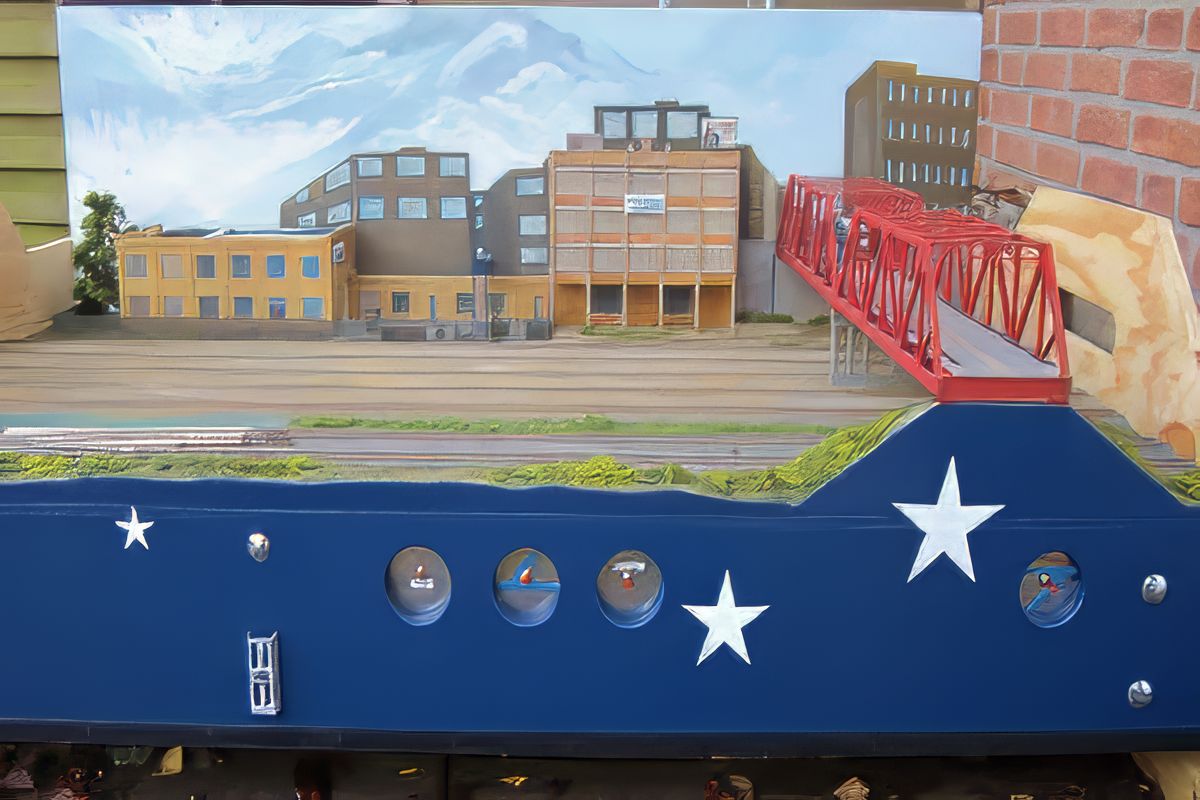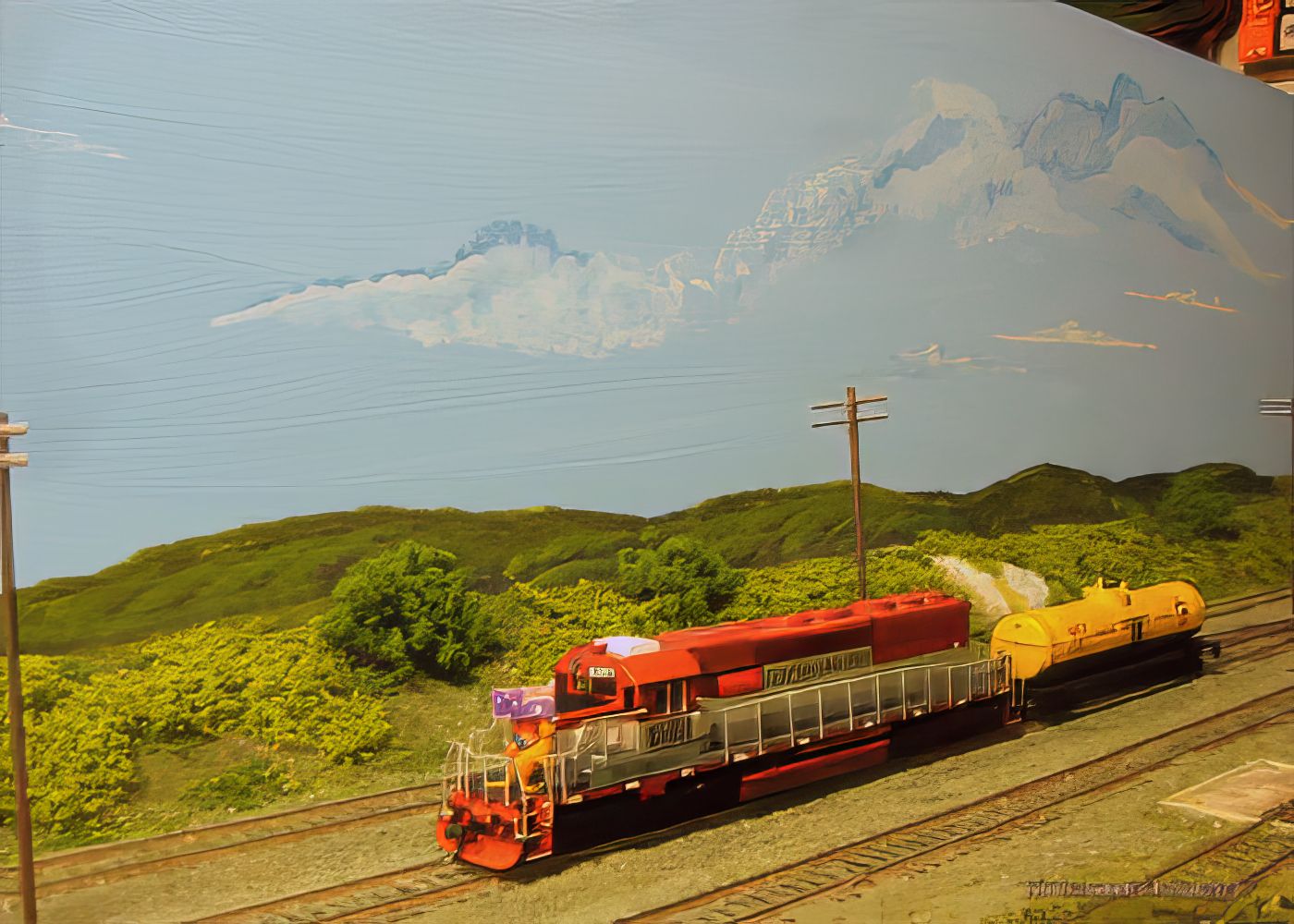 Bild 16 - Hinter den Häusern----ja, und eine Bastelei von Andy. Aus einem unlackierten Bausatz wurde für Bernd eine Southern-Pacific Caboose und für Dirk eine Caboose der New York Central gefertigt. Die Farbbeschaffung für die NYC war schwierig. Nun fehlen noch die Nassschieber mit den Logos. Die sind bestellt.