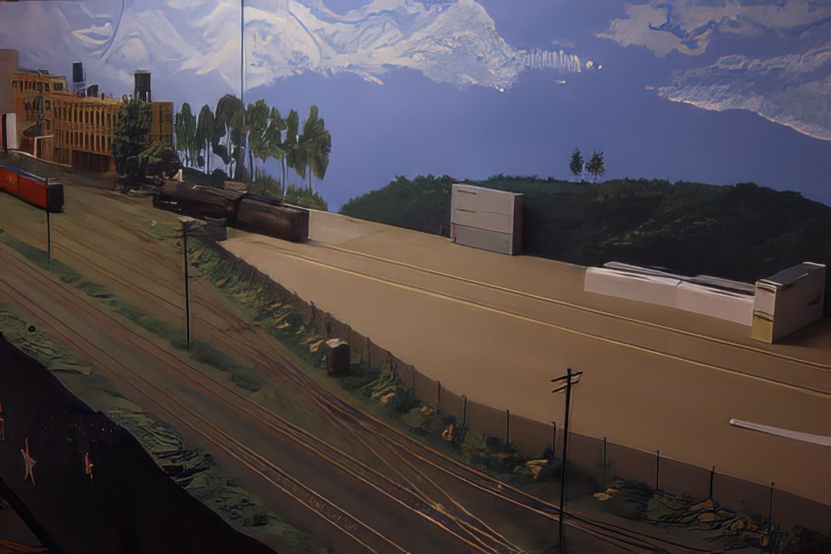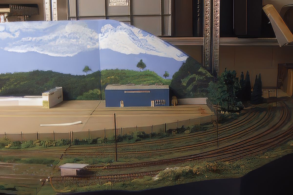Bild 2 - Hier zwei fertige Hintergründe auf der Anlage. Für uns, wunderschön. Um die Perspektiven zu halten, ist neben der Halle ein angeschnittenes, noch nicht lackiertes Zaunteil aufgestellt.