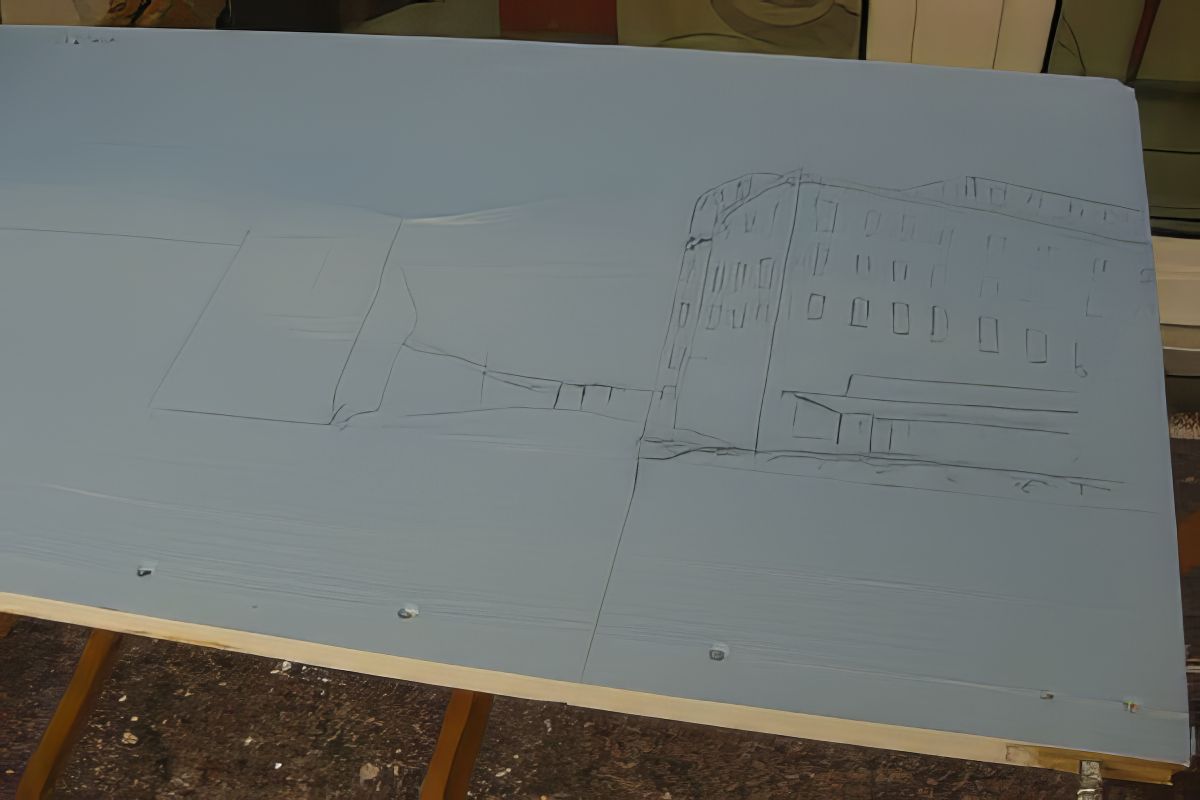 Bild 4 - Hinter dem Modul rund um Brot und Getreide geht es in unsere Stadt Dakota über. Besonders knifflich für die Hintergrundmalerei ist auf diesem Modul die Einbindung der Straße von der Brücke in die Stadt. Hier Martins Bleistiftskizze. Die Straße verschwindet nach rechts hinter der Bebauung.